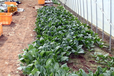・雨よけ、風よけ、温度調節、遮光などが十分調節できなく、野菜の生長に影響があるものの、ほうれん草、小松菜を栽培、出荷を続けている。