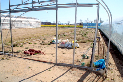 ・風圧で、アーチパイプ、サイドパイプなど、骨組みが大きく変形したビニールハウスは、ビニールシート、遮光シートの張り替えなども十分できず、温度、光量コントロールに支障があるのと、ハウス内での耕運機などの機械作業もできないため、野菜栽培を中止。