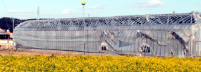 [骨組みの被害が軽微で、ビニール、遮光ネットが被害のビニールハウス]