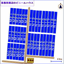 ・野菜栽培事務所の南側に9棟、北側に36棟あり。